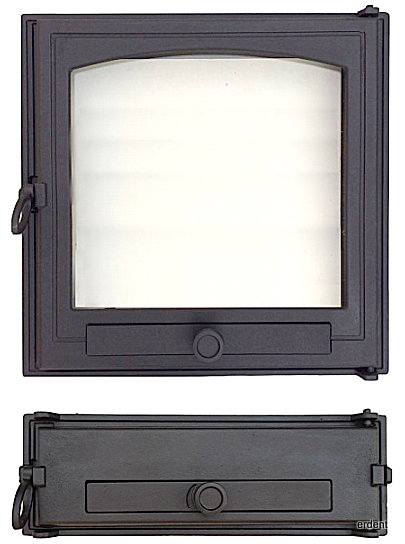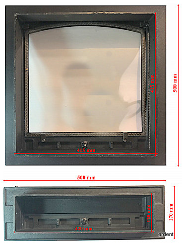 Porte de foyer avec cendrier en fonte avec vitre ceramique. - Encombrement porte de cendrier: 500x170 mm.