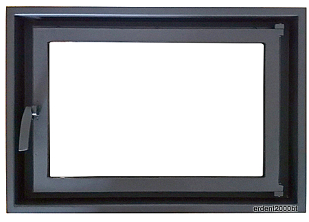 Porte de foyer en fonte avec vitre ceramique Robax. Porte en fonte incorporée dans un cadre en acier.